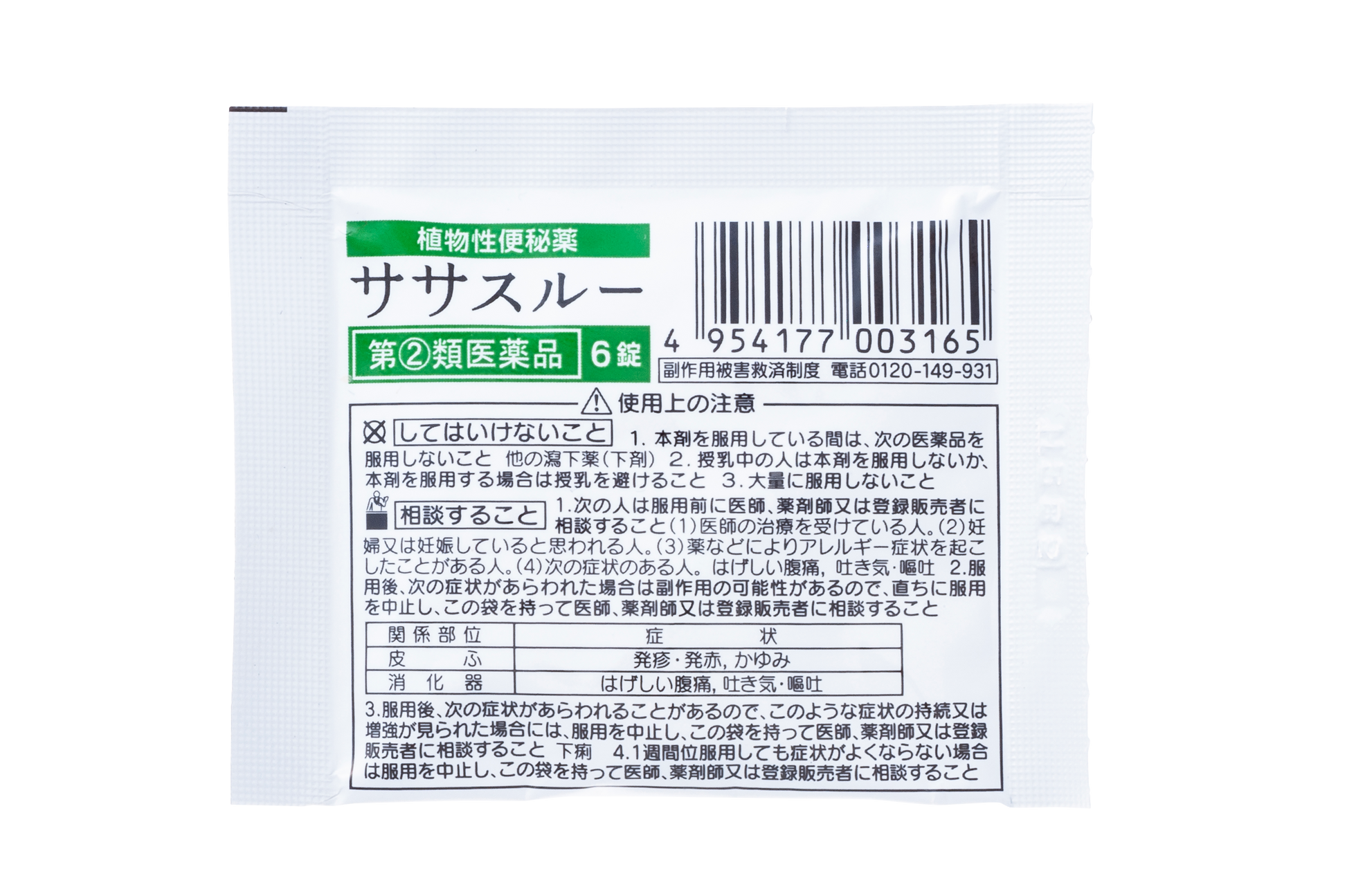「ササスルー」は下記の8つの植物性生薬を配合した便秘薬で、着色剤としてクマザサの葉の抽出液を使用しています。
