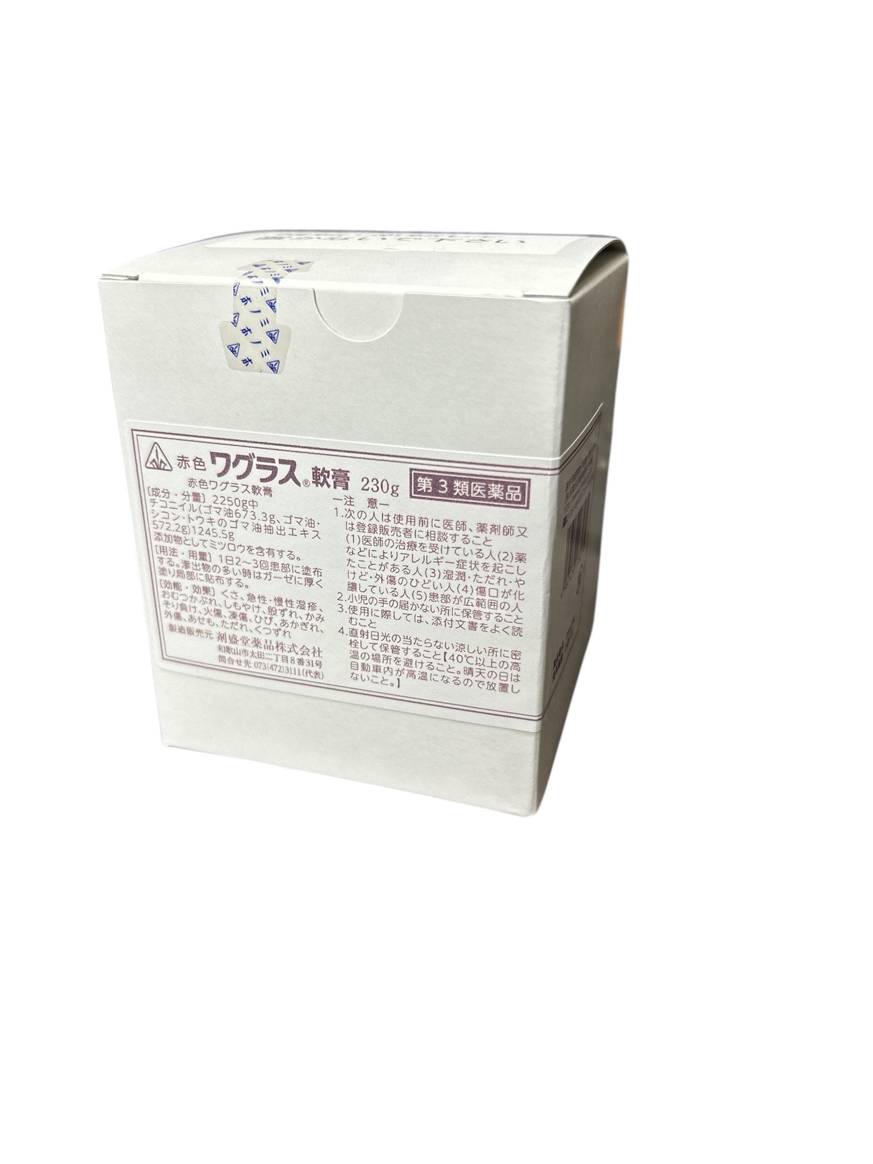 赤色ワグラス軟膏は、ひび・あかぎれ・かみそり負けなどの創傷性の皮膚疾患や、血行障害により起こるしもやけ・凍傷など、さらには火傷(やけど)を改善するよう考え出された外用の軟膏剤(塗り薬)です。